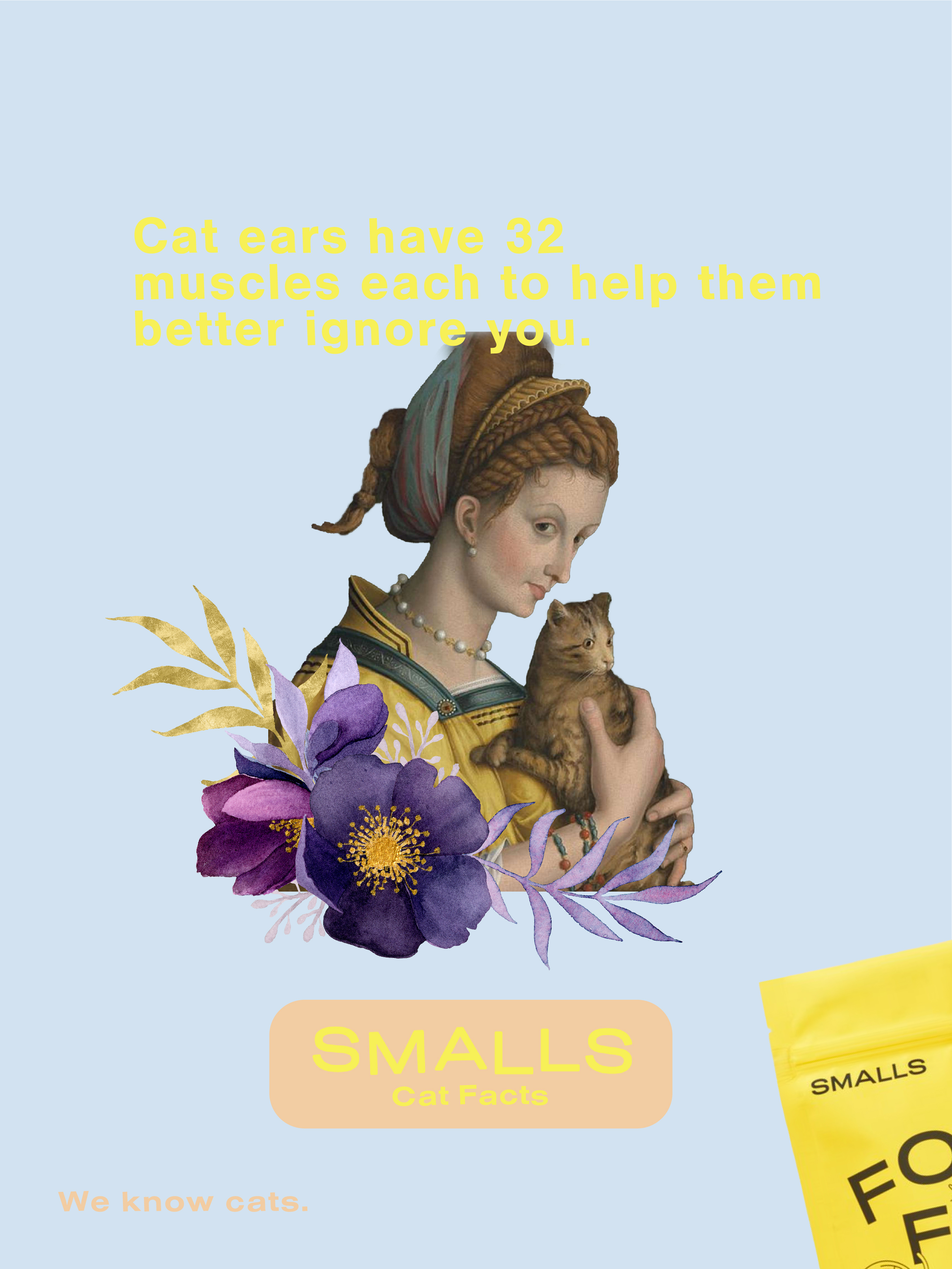 Smalls is all about cats. Just like you are. And if I have any say in it, Smalls is also all about Renaissance cats collaged with stock-sourced florals, because it’s cool.
